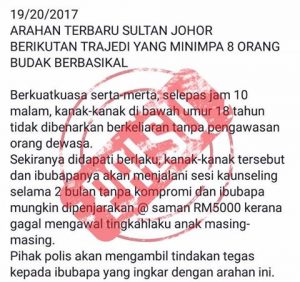 Arahan tersebut kononnya dikeluarkan berikutan kejadian kemalangan maut yang melibatkan kanak-kanak berbasikal di Johor.
